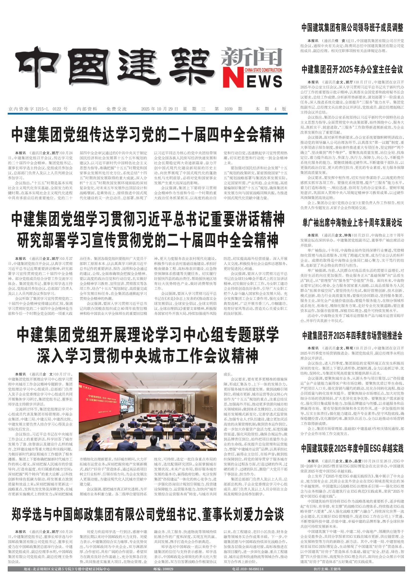 本报讯(通讯员企文、班厅)10月27日,中建集团党组召开会议,认真学习贯彻习近平总书记近期重要讲话精神,研究部署学习宣传贯彻党的二十届四中全会精神。部分党组成员结合分管工作交流学习体会。集团党组书记、