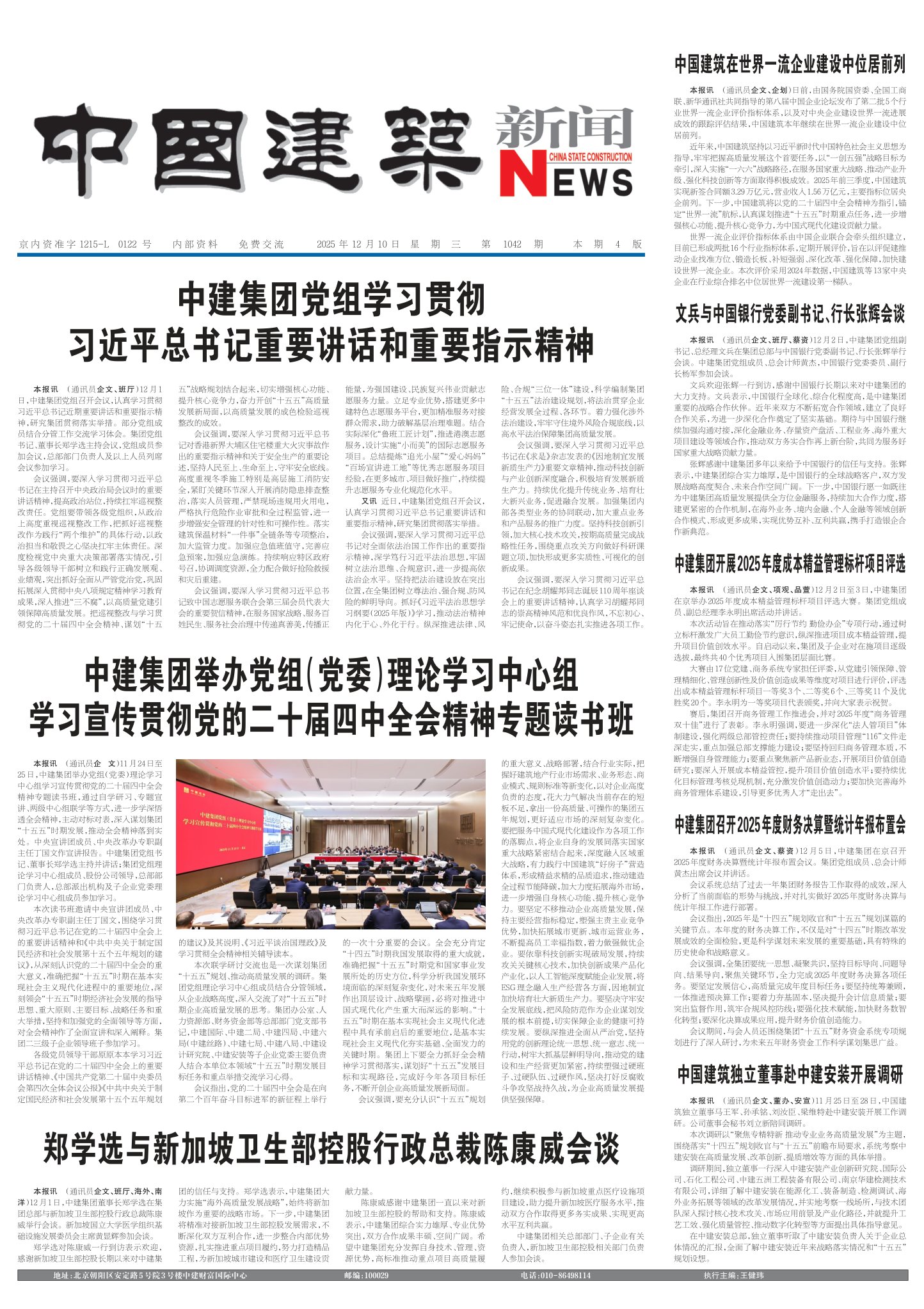 本报讯(通讯员企文、班厅)12月1日,中建集团党组召开会议,认真学习贯彻习近平总书记近期重要讲话和重要指示精神,研究集团贯彻落实举措。部分党组成员结合分管工作交流学习体会。集团党组书记、董事长郑学选主