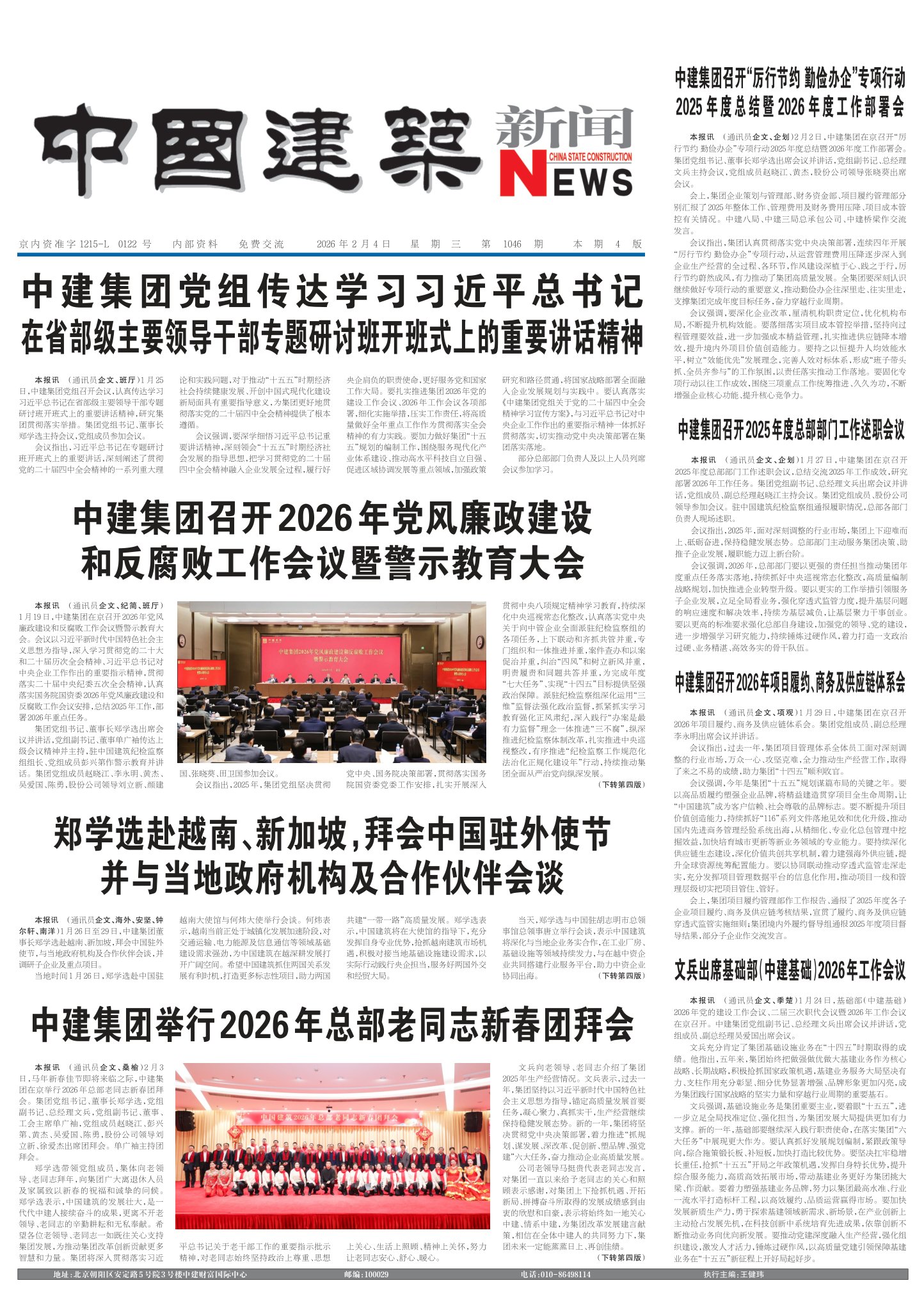 2025年度总结暨 2026 年度工作部署会本报讯(通讯员企文、企划)2月2日,中建集团在京召开“厉行节约勤俭办企”专项行动2025年度总结暨2026年度工作部署会。集团党组书记、董事长郑学选出席会议并讲话,党组副书记、总经理文兵主持会议,党组