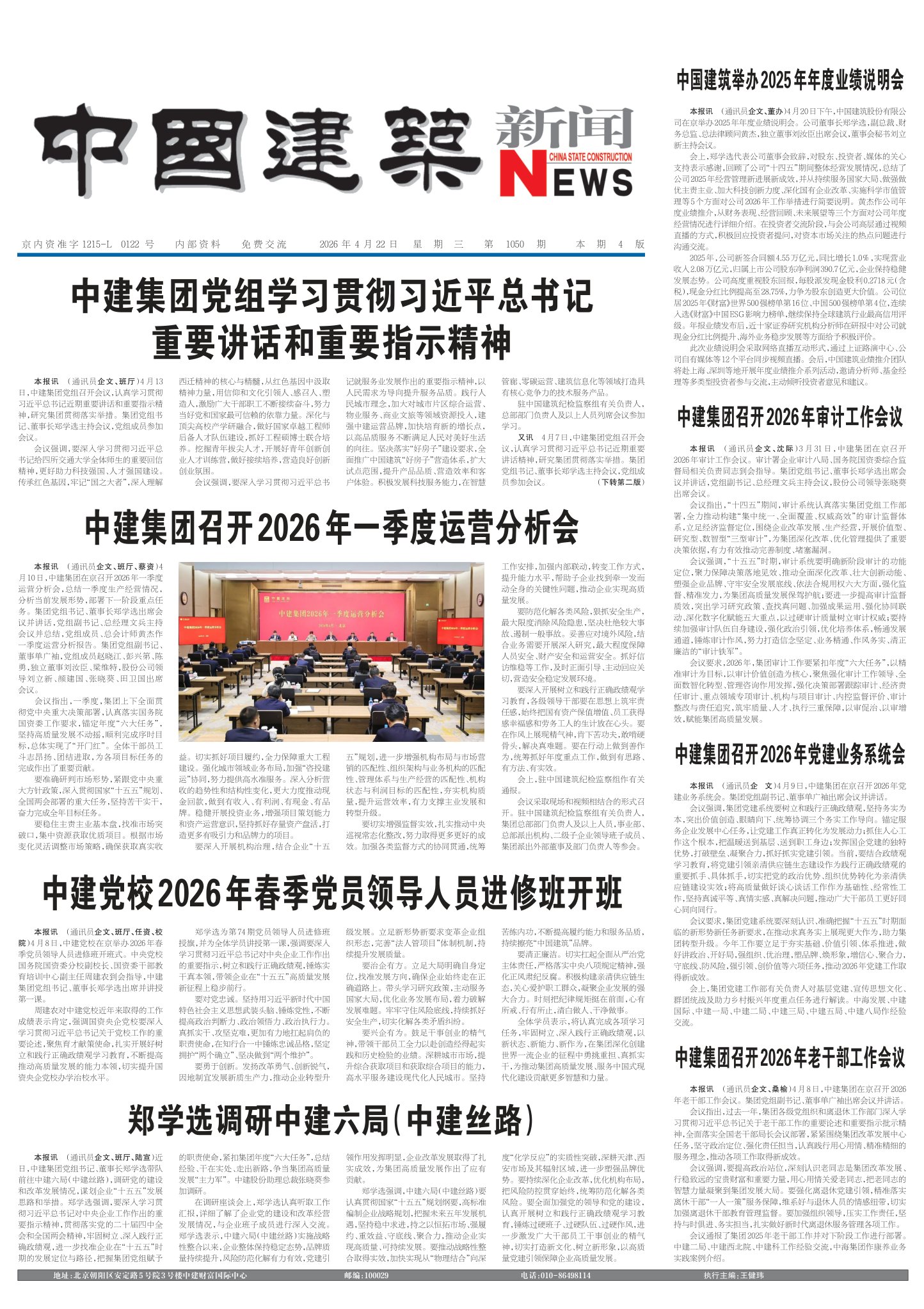 本报讯(通讯员企文、班厅、蔡资)4月10日,中建集团在京召开2026年一季度运营分析会,总结一季度生产经营情况,分析当前发展形势,部署下一阶段重点任务。集团党组书记、董事长郑学选出席会议并讲话,党组副
