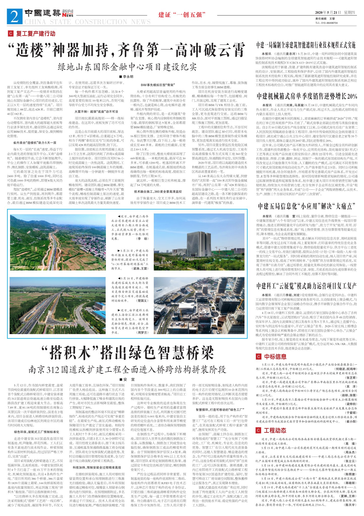 5月 12日, 作为国内桥宽最宽、 盖梁节段吨位最重的装配式桥梁项目、 江苏省首个装配式公路桥梁项目, 中建安装承建的 312 国道南京绕越高速公路至仙隐北路段改扩建工程迎来重大节点。首根高7.89 米、 重 81.18 吨的预制墩柱在南象山风景区段一次平稳拼装到位, 误差在2毫米内, 项目全面进入桥跨结构拼装阶段。该项目建成后仙林地区到南京市区的通行时间将大大缩短。
