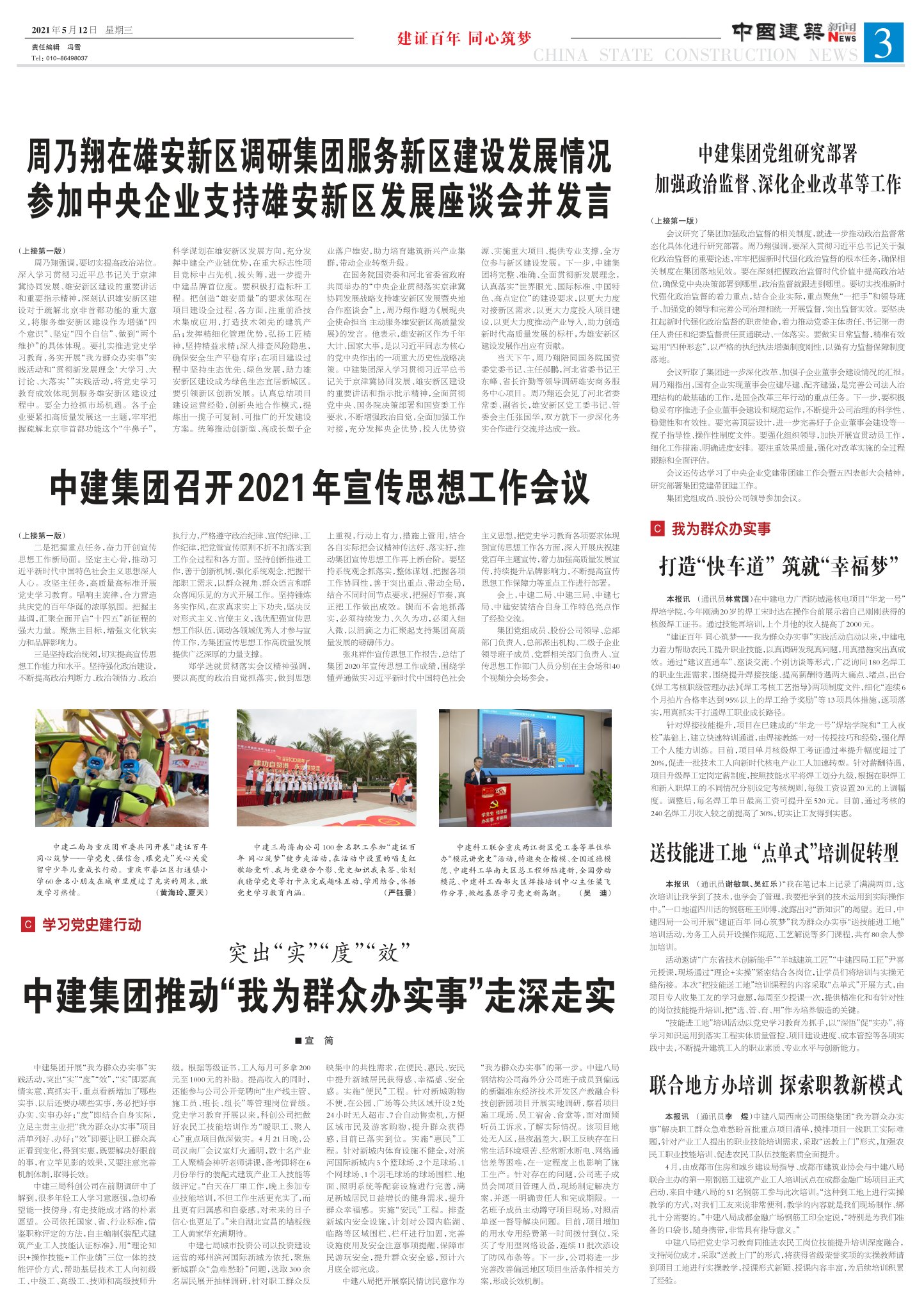 中建集团开展“我为群众办实事”实践活动,突出“实”“度”“效”,“实”即要真情实意、真抓实干,重点看新增加了哪些实事、以后还要办哪些实事,务必把好事办实、实事办好;“度”即结合自身实际,立足主责主业把“我为群众办实事”项目清单列好、办好;“效”即要让职工群众真正看到变化,得到实惠,既要解决好眼前的事,有立竿见影的效果,又要注意完善机制体制,取得长效。