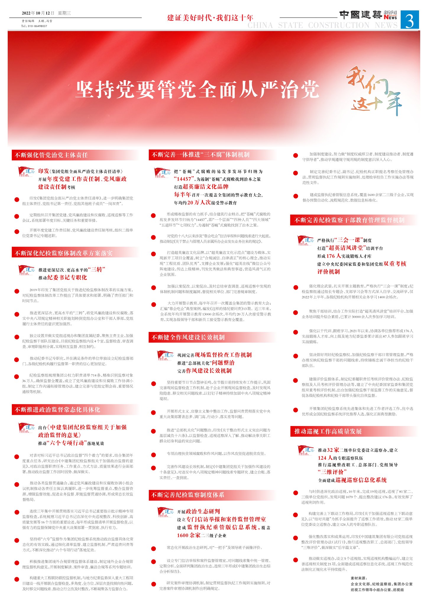 ● 强化整改落实和成果运用,印发《中国建筑集团有限公司党组巡视整改评价管理办法(试行)》,推行巡视整改职工、总部部门、党组领导“三维评价”,做深做实“后半篇文章”。