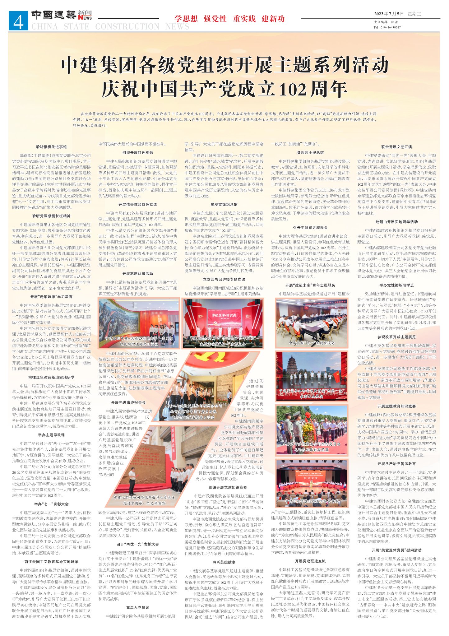 在全面贯彻落实党的二十大精神开局之年,我们迎来了中国共产党成立102周年。中建集团各基层党组织开展“学思想、见行动”主题系列活动,以“建证”党建品牌为引领,通过主题党课、“七一”表彰、座谈交流、实地研学、党员志愿服务等多种形式,深入开展学习贯彻习近平新时代中国特色社会主义思想主题教育,引导广大党员干部职工坚定不移听党话、跟党走,踔厉奋发、勇毅前行。