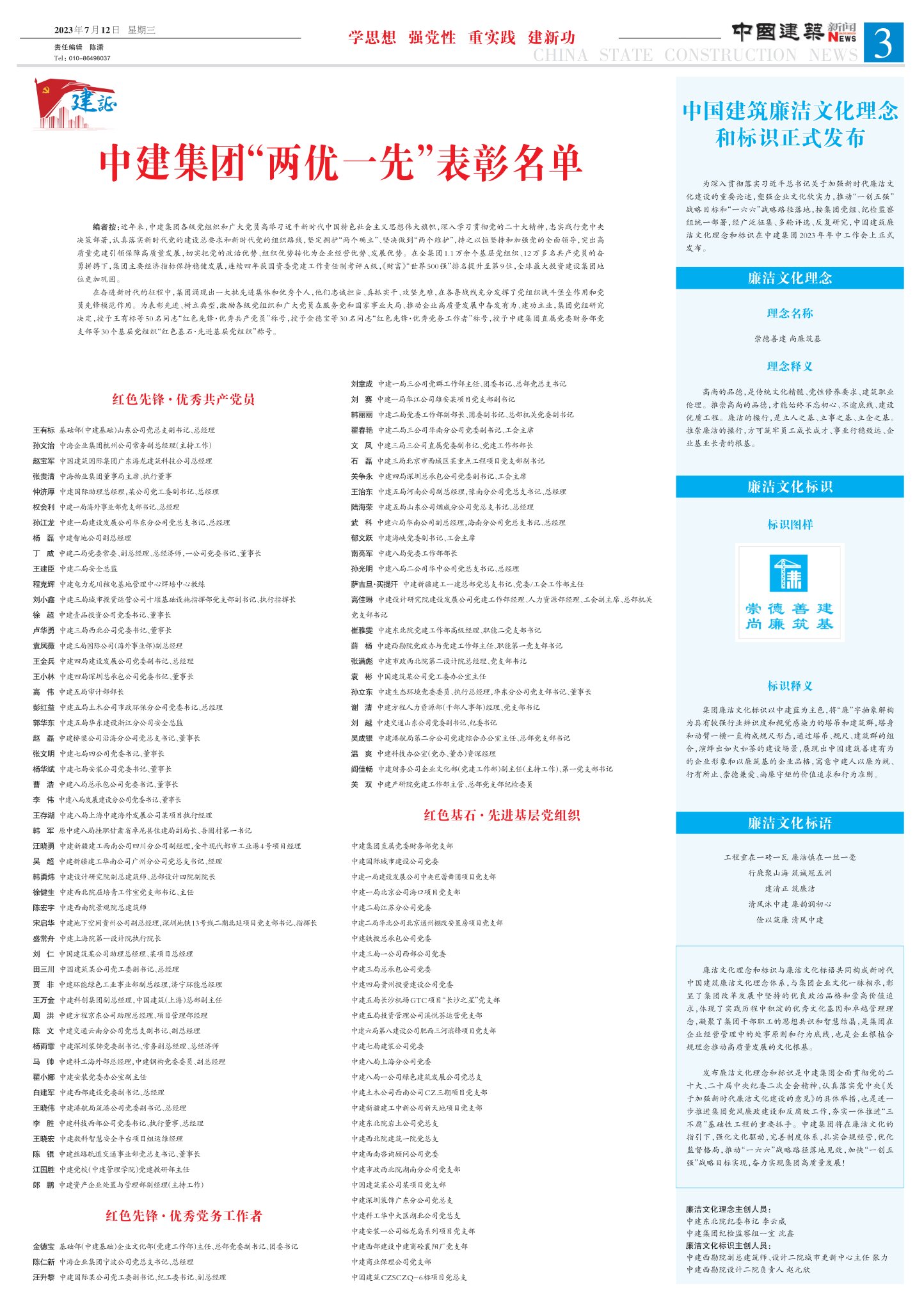 为深入贯彻落实习近平总书记关于加强新时代廉洁文化建设的重要论述,塑强企业文化软实力,推动“一创五强”战略目标和“一六六”战略路径落地,按集团党组、纪检监察组统一部署,经广泛征集、多轮评选、反复研究,中国建筑廉洁文化理念和标识在中建集团 2023 年年中工作会上正式发布。