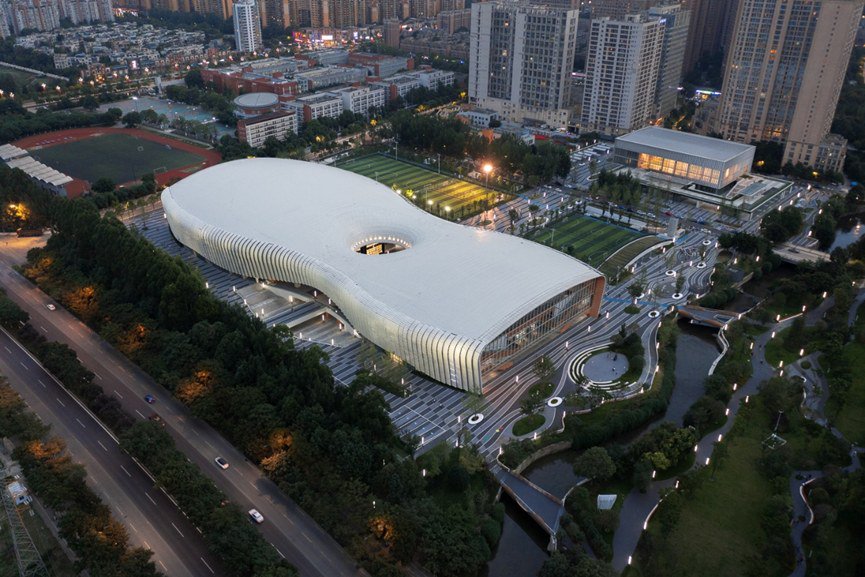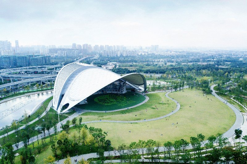 凤凰山体育中心将两个独立的场馆连成一个整体,形成一个连续、生长的形态。从空中来看,它好似成都的盖碗茶,足球场是茶碗,体育馆是茶盖,项目的大平台是茶托。
