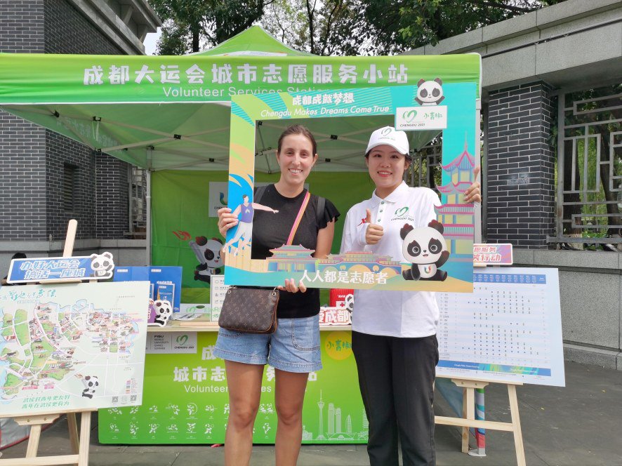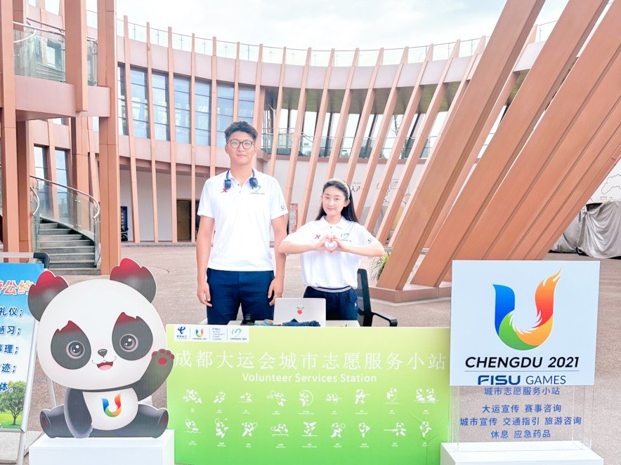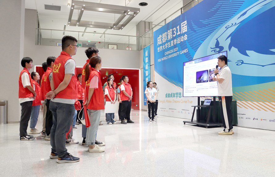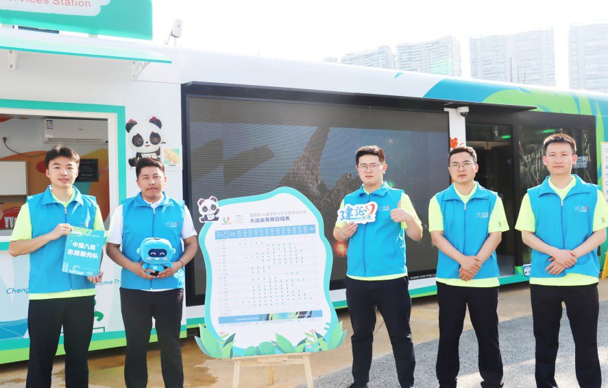 中建西南院“建证未来”青年志愿者为来自世界各地的游客及市民提供城市宣传、赛事资讯、购票指南、场馆介绍、交通指引、便民服务等。其中,高新区环球中心站点是高新区示范站点。(邓可)