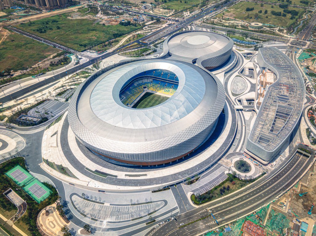 该体育中心包含一座满足 FIFA 标准、6万个座位的专业足球场,一座满足 NBA 标准、1.8 万个座位的综合体育馆以及多功能馆,形成造型舒展、流畅优美、张弛有度的建筑体量。外立面将银白色与银灰色的穿孔铝板在不同曲面上进行有序交织,形成波光粼粼的编织肌理;中部的架空又增加了空间趣味与层次变化;商业、酒店等配套服务设施呼应流线造型自然展开,打造出层次丰富、充满活力的公共空间,形成以体育为主题、业态丰富、全天候运营的体育公园。