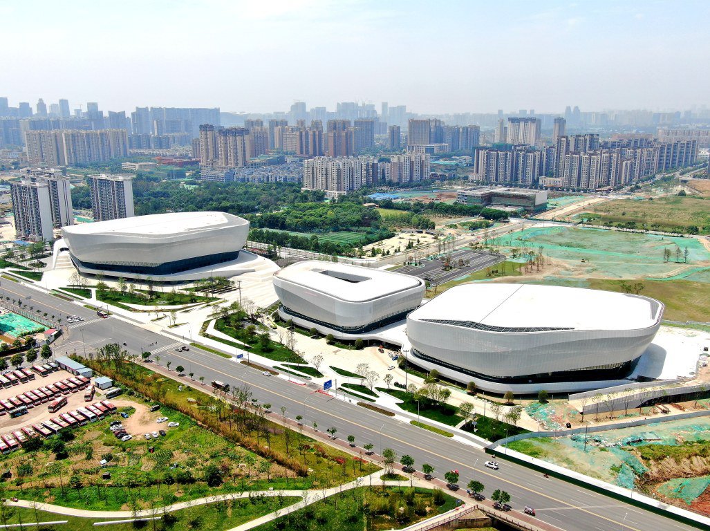 成都高新区体育中心由中建西南院以设计牵头的总承包模式承建,是三栋硕大的亮白色单体建筑,造型独特、生动舒展、错落有致,从高处俯瞰,仿佛三颗宝石嵌入绿色公园之中,闪烁着绚丽夺目的光彩……作为四川省内目前最大的体育馆,这里是大运会乒乓球大赛主场馆。