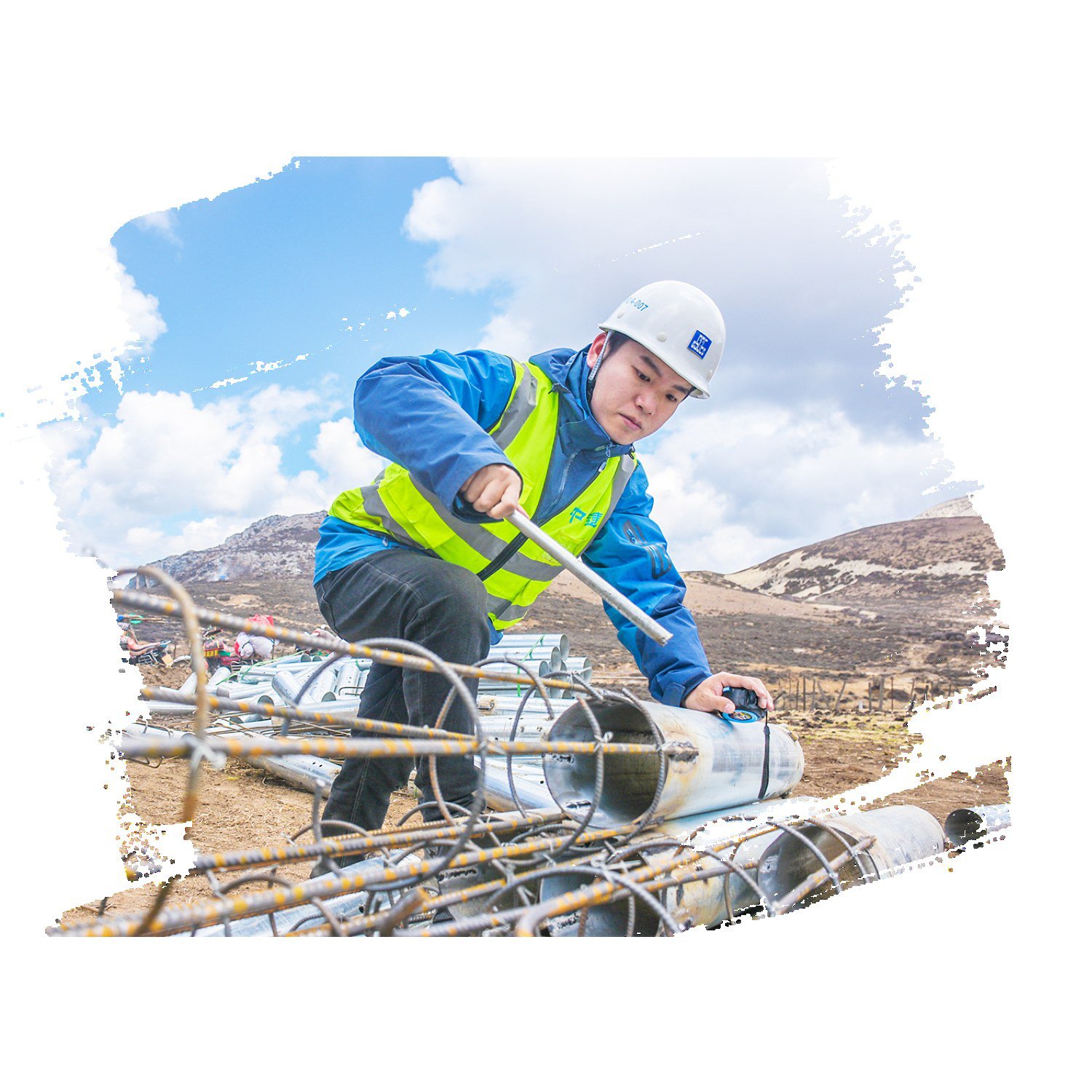 困难久攻不破的时候,我也怀疑过自己选择再上凉山是不是“自找苦吃”?但是看到身边的同事,他们初战高原项目就越是艰难越向前,我还有什么理由退缩?我们一起并肩作战,一边适应着高原环境,一边推进项目建设。经过团队反复论证与优化,最终我们采用自主改装的履带式液压驱动旋挖钻机进行钻孔施工,平均 5 分钟成孔,极大缩短了孔壁裸露和机器摩擦时间,尽可能减少了冻土的融化,提高了支架安装的稳定性。