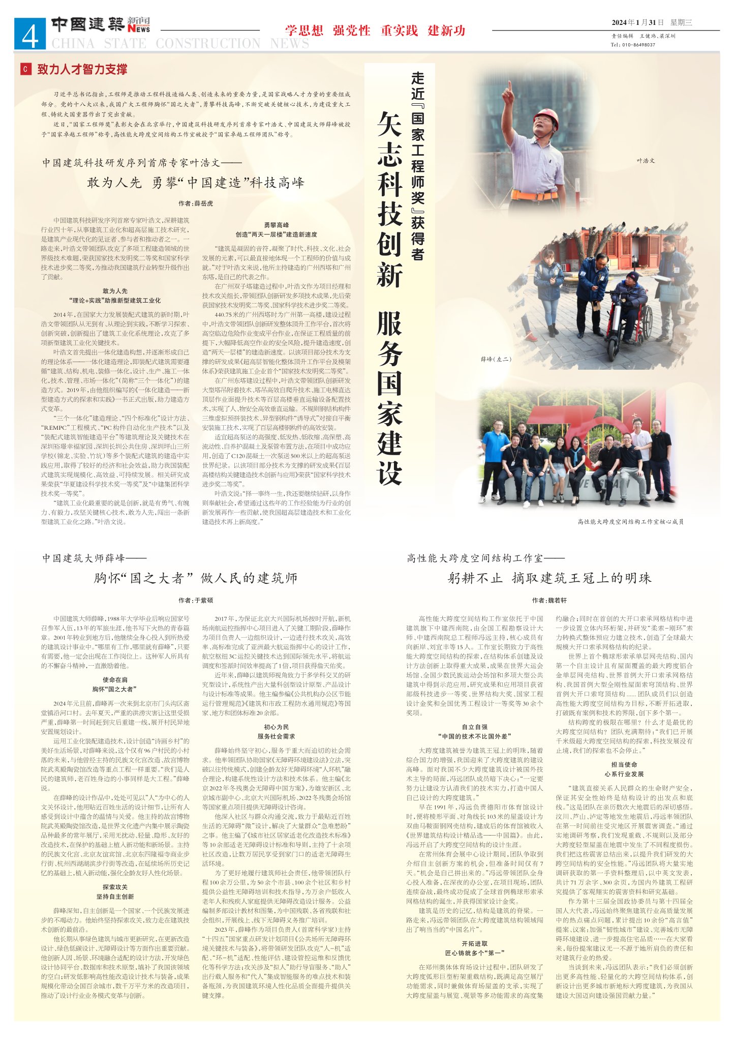 近日,“国家工程师奖”表彰大会在北京举行,中国建筑科技研发序列首席专家叶浩文、中国建筑大师薛峰被授予“国家卓越工程师”称号,高性能大跨度空间结构工作室被授予“国家卓越工程师团队”称号。