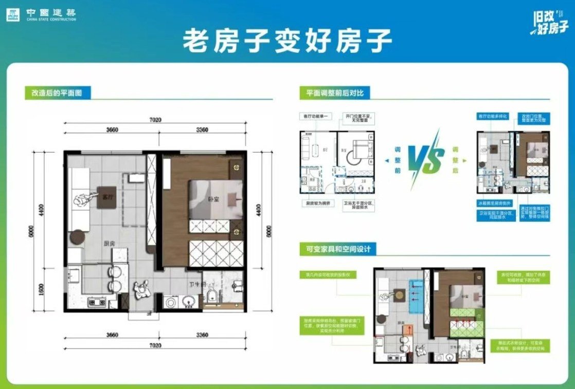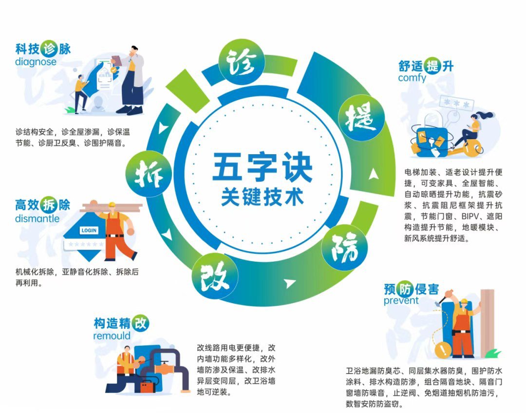 中建集团旗下中建五局响应“好房子”建设行动,以自研智能装配式技术为核心,依托“投资-研发-设计-建造-运营”全产业链,运用诊、拆、改、防、提“五字诀”,制定“入户旧改”一揽子方案,配套开发出12项新技术、16项新产品、6项新工艺,因地制宜、快速高效地解决老房子墙体结构损坏、基础设施老化、空间局限、采光、保温、隔音差、渗漏、返臭等常见问题,让旧房经过改造后实现空间充分利用、品质整体提升。老房子变成安全、舒适、绿色、智慧的好房子。