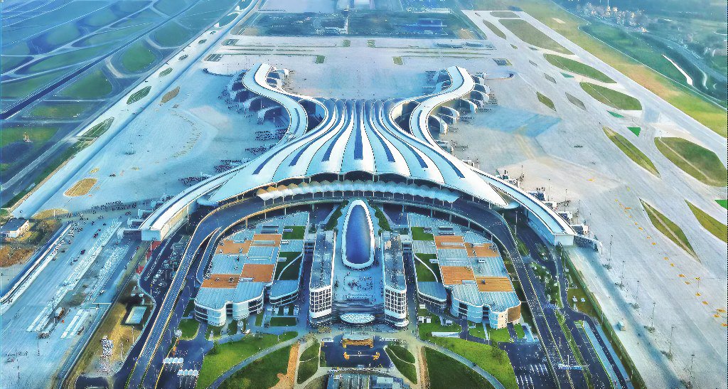 在造型上,T3航站楼巧妙收窄东西两翼,结合H形与X形的组合优势,使其犹如矗立在地面上的“小蛮腰”。这样的设计不仅是美学的表达,更蕴含着实用考量,可以有效缩短旅客从航站楼中央区域前往各指廊登机口及中转流程的平均步行距离。在旅客出行便捷的同时,还能让更多机位同时独立运行,优化了空侧运行效率。