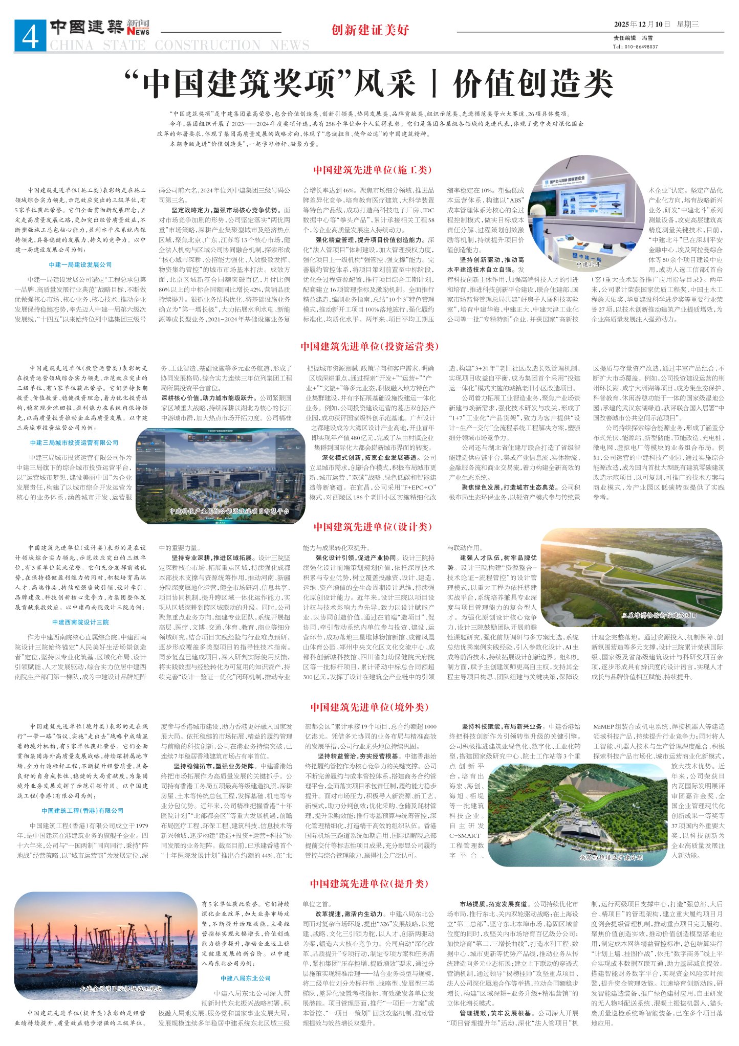 坚持创新驱动,推动高水平建造技术自立自强。发挥科技创新主体作用,加强高端科技人才的引进和培育,推进科技创新平台建设,联合住建部、国家市场监督管理总局共建“好房子人居科技实验室”,培育中建华海、中建正大、中建天津工业化公司等一批“专精特新”企业,并获国家“高新技术企业”认定。坚定产品化产业化方向,培育战略新兴业务,研发“中建北斗”系列测量设备,攻克高层建筑高精度测量关键技术,目前,“中建北斗”已在深圳平安金融中心、埃及阿拉曼综合体等50余个项目建设中应用,成功入选工信部《首台(套)重大技术装备推广应用指导目录》。两年来,公司累计荣获国家优质工程奖、中国土木工程詹天佑奖、华夏建设科学进步奖等重要行业荣誉27项,以技术创新推动建筑产业提质增效,为企业高质量发展注入强劲动力。