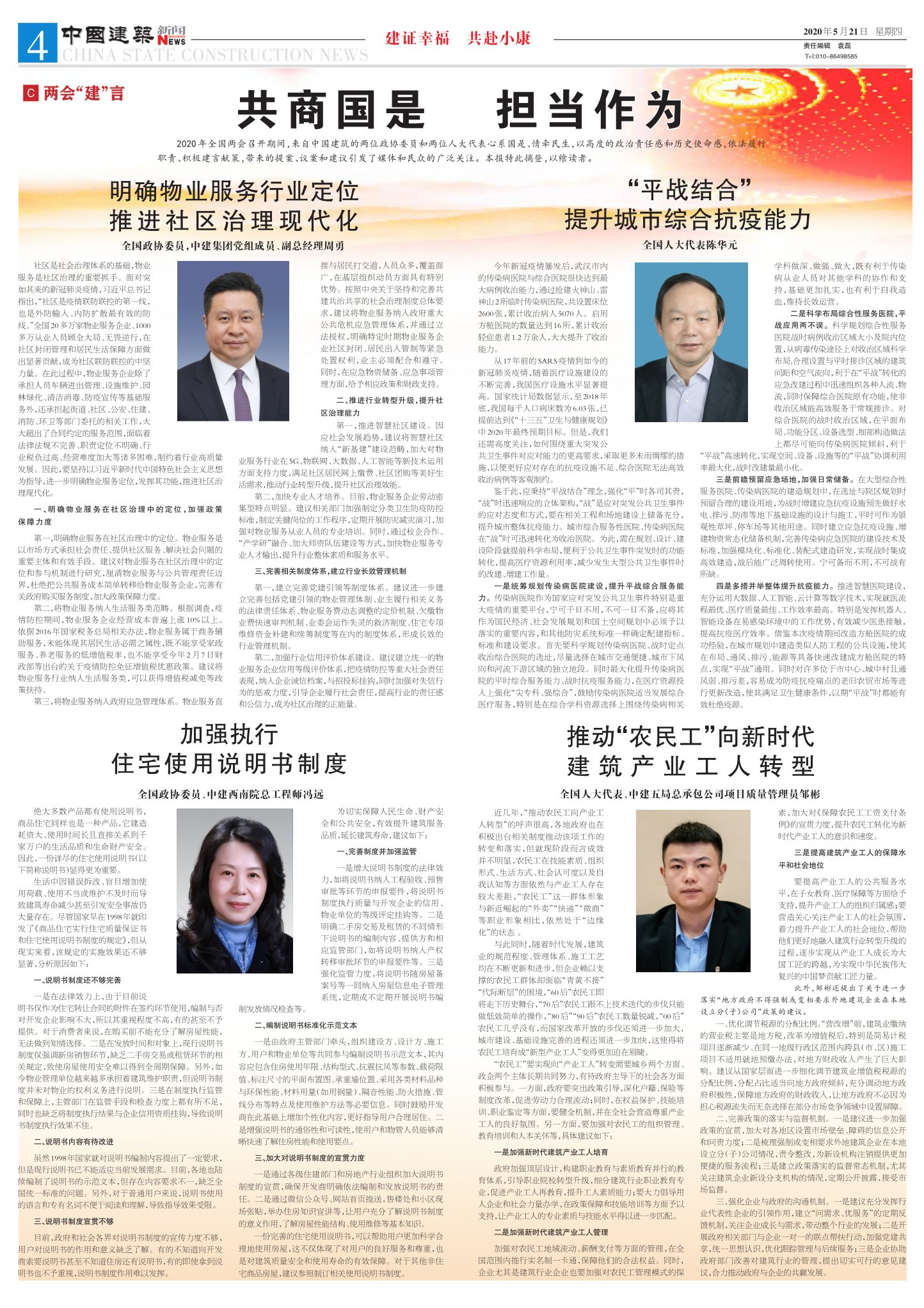 2020年全国两会召开期间,来自中国建筑的两位政协委员和两位人大代表心系国是、情牵民生,以高度的政治责任感和历史使命感,依法履行职责、积极建言献策,带来的提案、议案和建议引发了媒体和民众的广泛关注。本