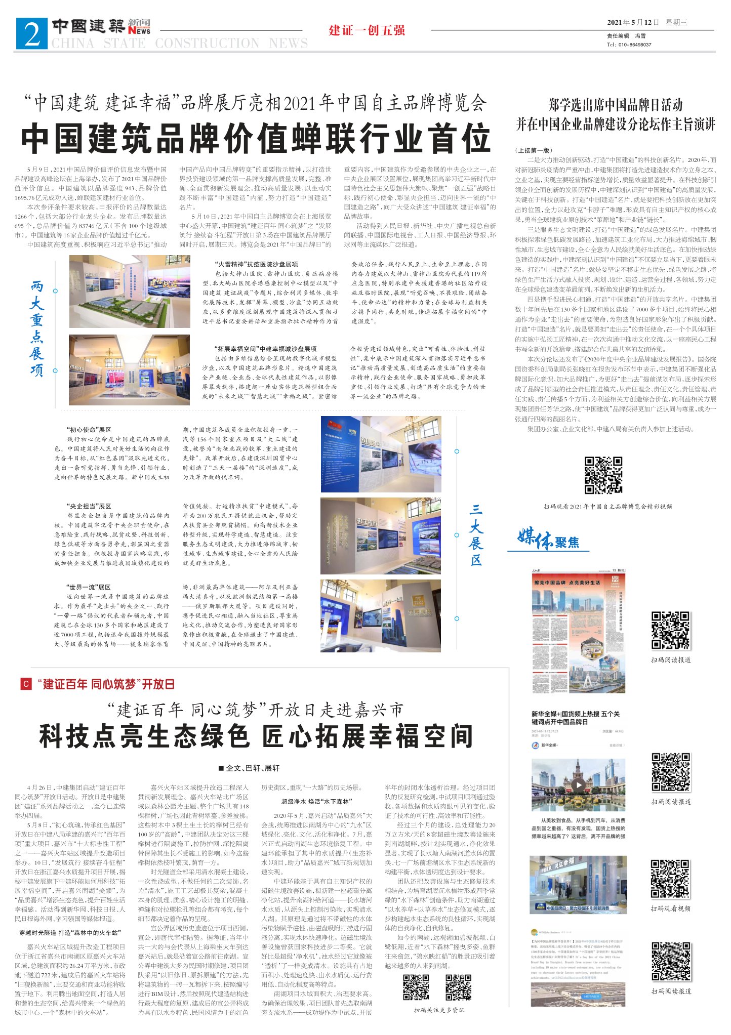 4月26日,中建集团启动“建证百年同心筑梦”开放日活动。开放日是中建集团“建证”系列品牌活动之一,至今已连续举办四届。5月8日,“初心筑魂,传承红色基因”开放日在中建八局承建的嘉兴市“百年百项”重大项