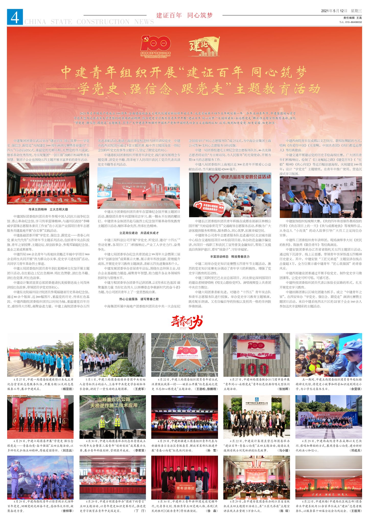 2021年是中国共产党成立100周年、全面建设社会主义现代化国家新征程开启之年,也是实施第十四个五年规划第一年。今年五四青年节,中建集团深入学习习近平总书记在清华大学考察时的重要讲话精神,结合党史学习