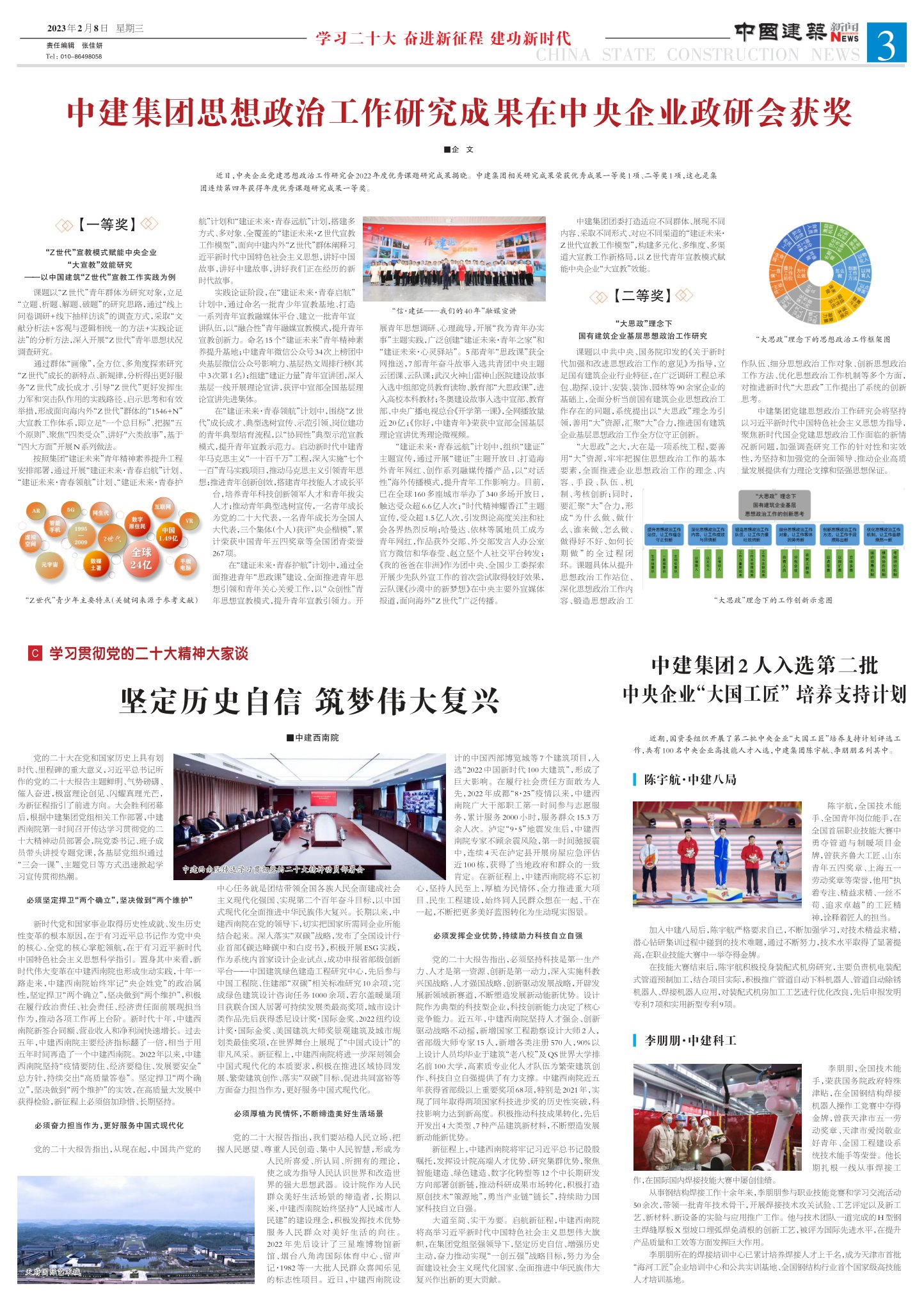 在中央企业政研会获奖近日,中央企业党建思想政治工作研究会2022年度优秀课题研究成果揭晓。中建集团相关研究成果荣获优秀成果一等奖1项、二等奖1项,这也是集团连续第四年获得年度优秀课题研究成果一等奖。【一等奖】“Z世代”