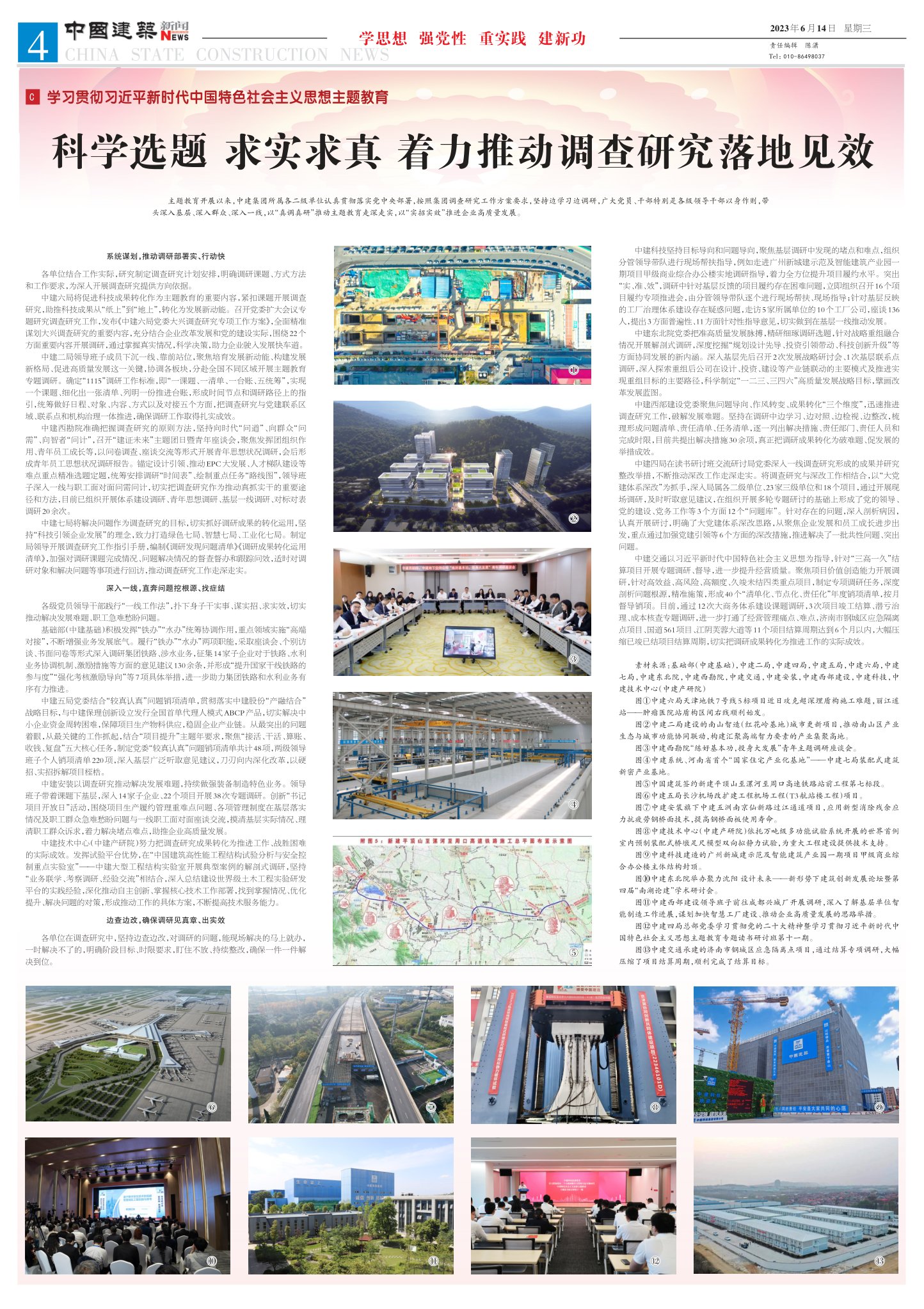 主题教育开展以来,中建集团所属各二级单位认真贯彻落实党中央部署,按照集团调查研究工作方案要求,坚持边学习边调研,广大党员、干部特别是各级领导干部以身作则,带头深入基层、深入群众、深入一线,以“真调真研