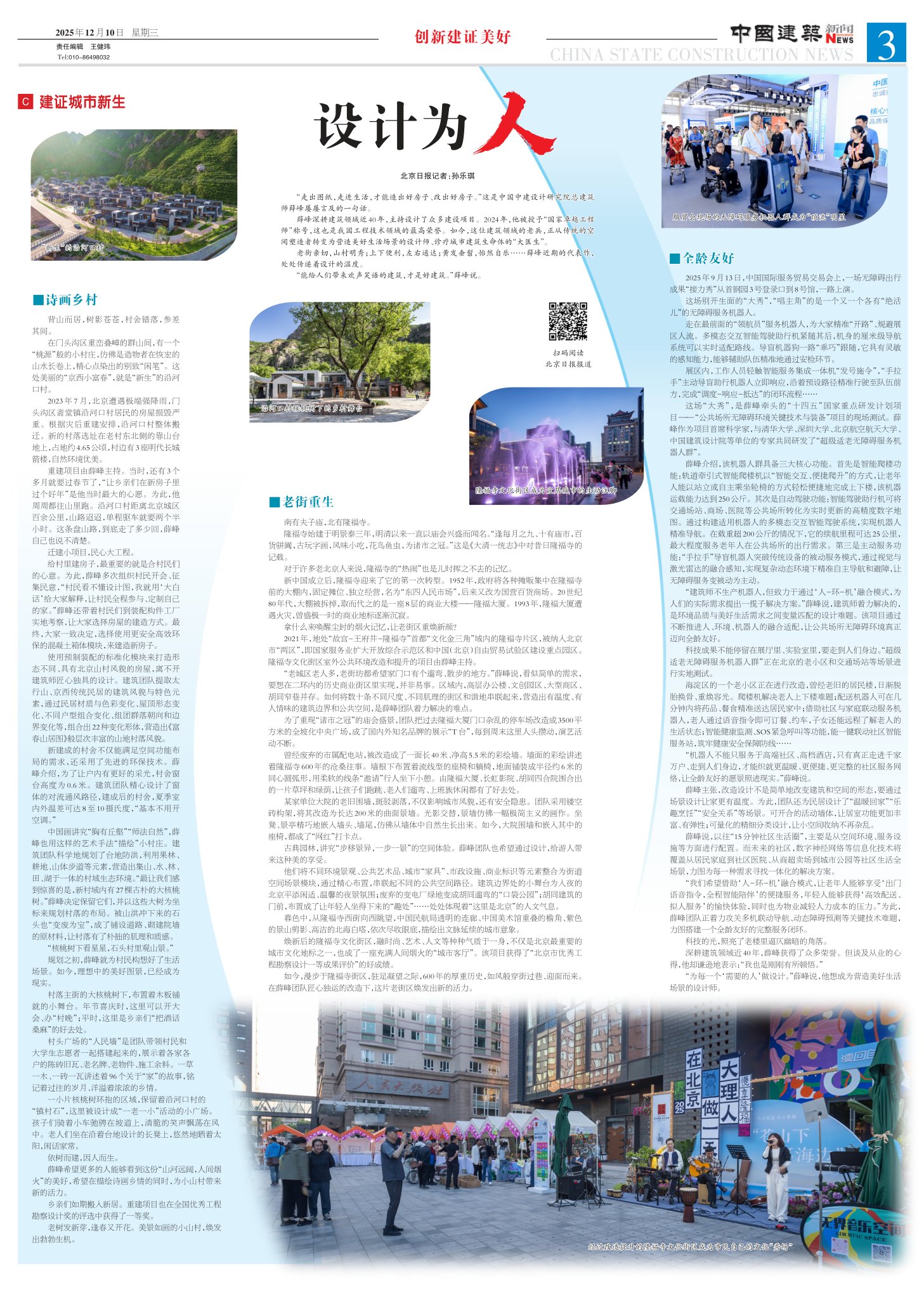 “走出图纸,走进生活,才能造出好房子、改出好房子。”这是中国中建设计研究院总建筑师薛峰屡屡言及的一句话。薛峰深耕建筑领域近40年,主持设计了众多建设项目。2024年,他被授予“国家卓越工程师”称号,这